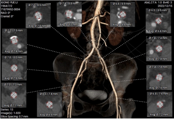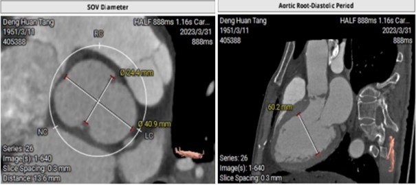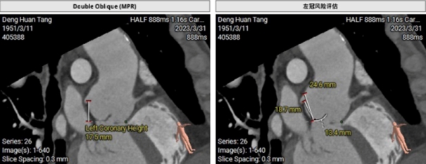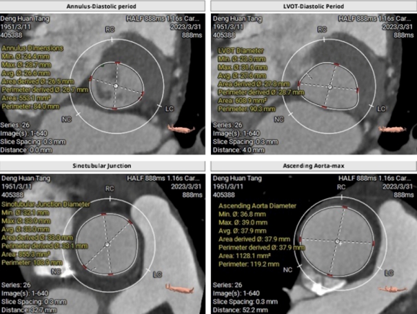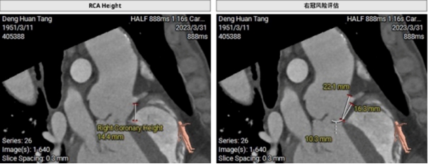 经心脏中心卢才义主任、李龙虎主任团队分析研判:此例患者结合临床明显瓣膜病症状以及在术前心室造影综合评估得出,此例患者为Type0二叶式重度主动脉瓣返流病人,瓣环周长84mm,LVOT周长90.3 mm,瓦式窦长径40.9mm,短径24.4mm,STJ 均径33.1mm,升主动脉均径35.2mm,左冠高度17.5mm,右冠高度14.4mm,下肢入路血管条件可。但CT造影提示主动脉瓣叶脱垂,流出道呈喇叭口状,且窦内钙化较轻缺乏有力锚定,考虑到植入后的人工瓣膜有一定的压缩比,锚定条件可,但不可过深植入,所以本次瓣膜的植入深度和瓣膜的锚定位置情况是本次手术的重要关键点。