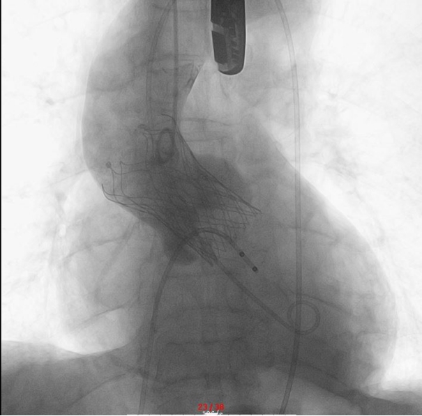 经过手术团队反复评估和研讨后,最终考虑选用右股动脉为主入路,导丝过瓣后,植入VitaFlow Liberty TAV30瓣膜,用DSR30电动可回收输送系统确保瓣膜的精准定位和释放,术后结合造影和超声,再评估是否需要瓣中瓣做为预案。