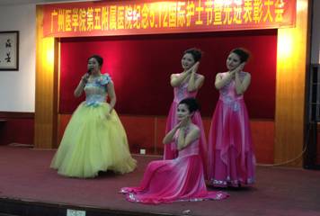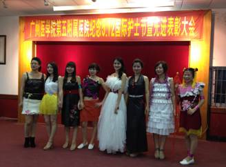 上半场的表彰才宣布暂告一段落,下半场的文艺演出主持人已迫不及待地上场了。现场一下子活跃起来。首先出场的是由北二病区的“天使们”演绎的藏族舞蹈《倾听世界的声音》,姑娘们曼妙的舞姿把现场观众带进了那神秘的藏区。当泌尿外科的姑娘们穿着用各种收集袋、环保袋、包装绳制作出来的或典雅、或高贵、或活泼的时装亮相T台时,现场气氛达到了高潮!最后,工会杨绯琳老师的一曲《为爱干杯》赢得了持久的掌声!歌声久久回荡在礼堂的上空,护士节表彰大会在一片欢笑声中结束。