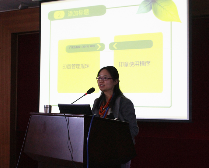 接着,班主任通过PPT展示,向与会者详细介绍我院印章管理规定和印章使用程序。其中,印章管理规定包括印章管理规定总则;印章的刻制与启用及印章的停用、销毁。在讲解的过程中,班主任根据遇到的情况,做出“停用的印章不得在原科室留存”;“科室印章使用需有监印人和相关流程”等提醒。