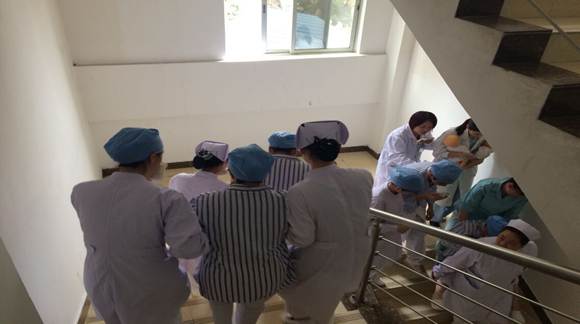 第二个被抽到的是产科。检查组人员临时改变演练情景,将火警现场设定在三楼,要求产科迅速组织撤离。接到检查组的通知,产科住院总肖医生立即重新部署。值班医生、护士、助产士、护工在肖总的一声令下,分工明确地迅速进入战斗状态。产妇组、孕妇组、婴儿组、贵重物品组有条不紊地撤离到安全地带,病区出口还有专人负责指引逃生出口!整个撤离过程仅用了15分钟!
