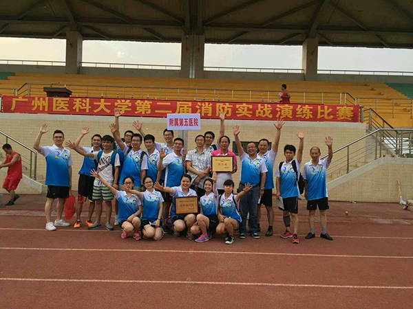 2015年11月9日,我院通过院内消防实战训练选拔20余名教职工参加“广州医科大学第二届消防实战演练”比赛。本次比赛参赛队伍多达21支。我院队员通过日常训练扎实,赛场上发扬敢打敢拼的作风,最终取得“灭火比赛第四名”、“扑灭煤气火焰比赛第五名”、“火场救护比赛第二名”和“接驳消防水带喷水灭火比赛第一名”的喜人成绩,并获得本次消防比赛“团体组第三名”。另外,我院领导对此次比赛高度重视,蔡刚副院长和总务科杨沈雷科长亲临现场指导比赛事宜。同时我院消防队伍也是众多队伍中参赛人员最多、队伍最整齐的,获得了校领导的一致认可,并授予“优秀组织奖”。
