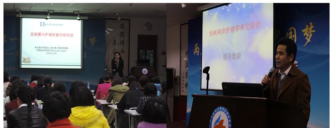 会议开始,江先汉副院长首先做了热情洋溢的大会致辞并预祝大会取得圆满成功。由台湾远道而来的新光吴火狮纪念医院护理部主任陈淑娟女士和质控中心主任林璟淑女士就慢性病患者的个案管理、品管圈与护理质量持续改进、医院安全与感染控制、人文关怀与优质护理服务、长期留置管道的护理与管理五个方面的主题做了主旨演讲,详细介绍了台湾同行的理念、做法,精彩的演讲引来阵阵掌声和笑声;大量翔实的资料和图片,让我们身临其境般地感受到台湾护理同行工作的严谨、服务的细致贴心、对患者的真诚关爱,由衷感叹台湾护理同行的敬业精神!