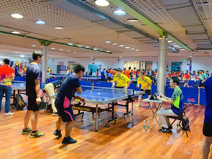 “乒乒乓乓,乒乒乓乓……”,乒乓球在台上来回飞舞,大家的眼睛都紧紧地盯着台上的小球,脑袋紧张地随球来回摆动着,不时发出阵阵喝彩声和热烈的掌声。场上队员不断变换侧跑步、并步、碎滑步、跨步、滑步等步式,采用接发球抢攻、下旋球、吊边角、提拉、大力扣杀、推挡等多种战术,甚至用假动作迷惑对手,或精准进攻,或巧妙防守,精彩场面层出不穷,现场其他球员们大呼过瘾,整个比赛紧张、有趣、生动、活泼。
