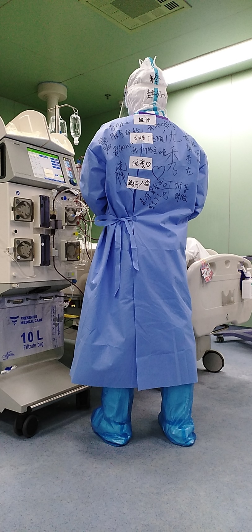 每天上班前,在穿戴防护用品时,大家都会互相给对方系隔离衣的带子,为对方写上名字,感觉自己的充满战斗力。我们组里唯三男神,就是我们的力量保证,其中一个就是来自我们医院,也是我的战友冯国勇是队里有爱的“南丁格尔”和“大力士”。每每遇到护理中的“体力活”时,他都会第一时间前来帮忙。尽管病房里的战友们都来自五湖四海的不同医院,我们都能迅速磨合,大家还常常在微信群里就某个护理问题提出自己所在医院的护理心得。短短一个多月的相处,在与这里来自不同医院的护理专业老师沟通交流收获甚至远远多于过去几年的收获。
