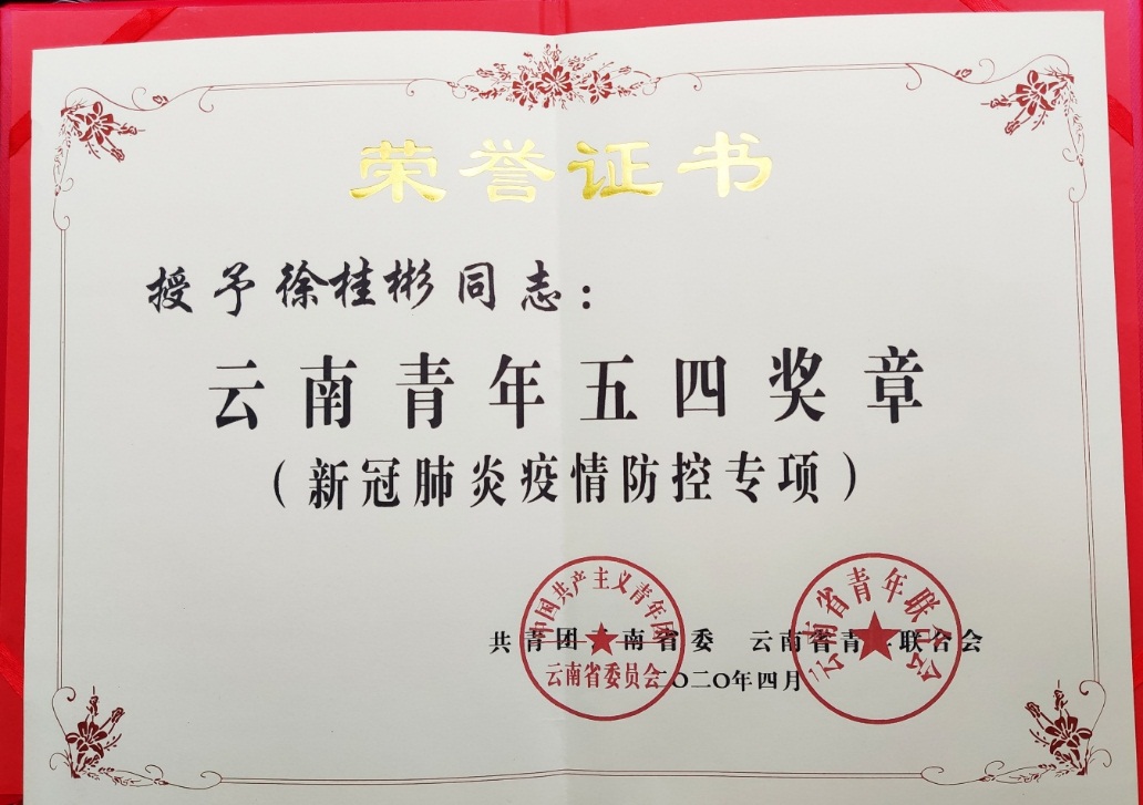 在五四青年节来临之际,我院泌尿外科临床重点专科负责人徐桂彬教授,中组部、团中央第20批赴滇博士团成员,昆明医科大学第二附属医院党委委员、副院长(挂职),荣获2020年“云南青年五四奖章”(新冠肺炎疫情防控专项)。