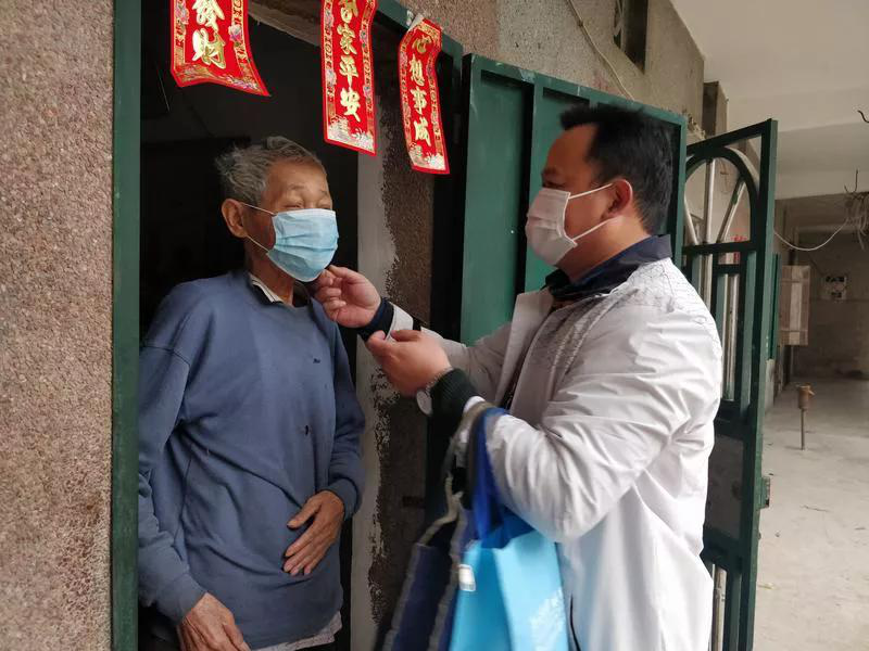 ▲邓茂发同志挨家挨户将口罩配发给贫困户