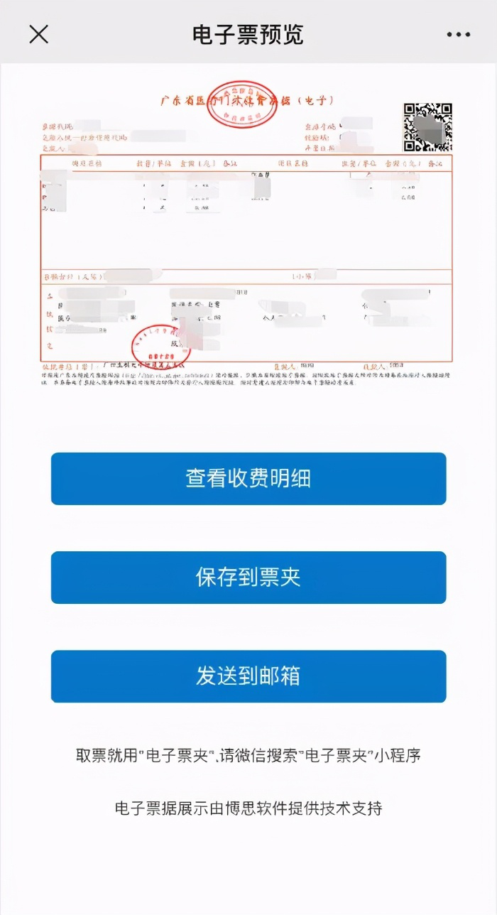 完成缴费3分钟后,使用微信扫一扫“门诊收费凭条二维码”进入电子票据预览。