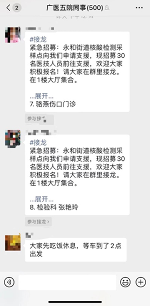 永和街人口密集,采样工作任务重。医院党委在得知永和街采样任务艰巨急需支援之时,又再次发出征集令,在院内迅速集结队伍出发支援。