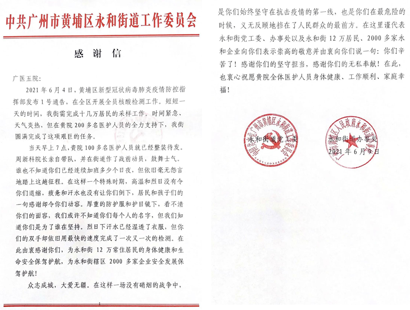 6月16日下午,黄埔区永和街道党工委、永和街道办事处将一面印着“白衣执甲抗击疫情 逆行出征守护永和”的锦旗、一封感谢信及慰问物资送至广医五院,感谢广医五院全力支持并用1天时间圆满完成永和街12万居民全员核酸检测工作,同时对医院医护人员主动投身疫情防控工作,不惧风险、不计报酬、无私奉献的精神给予了高度的认可和赞许。