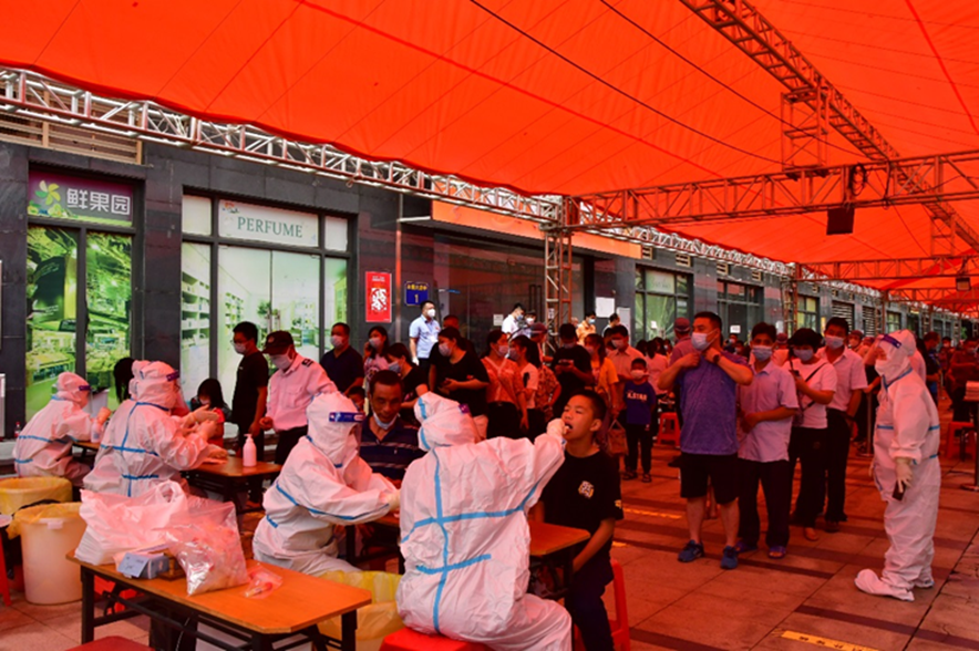临近夜晚,前去支援新龙镇的采样队在顺利完成任务后,也立即奔赴永和街开展支援。“龙舟水”搭配“蒸笼天”,从白天到黑夜,在大家的坚守和默契配合下,实现了“应检尽检,愿检尽检”的目标,圆满完成了十几万居民的采样任务。