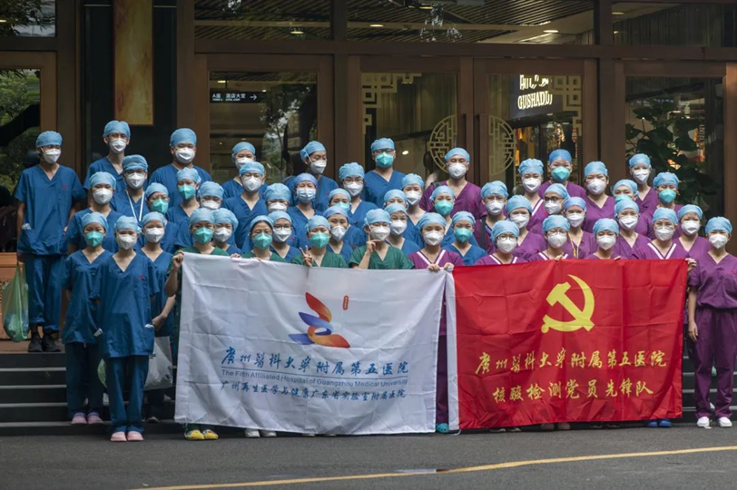 看,这是我们广医五院驻白鹤洞街核酸检测攻坚队“全家福”!我们众志成城,五院加油,广州必胜!
