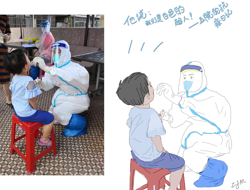 广医五院驻白鹤洞街核酸检测攻坚队队员每天挨家挨户上门为居民进行核酸采集。“哥哥姐姐们是白色的超人!”可爱的小朋友这样称呼我们。