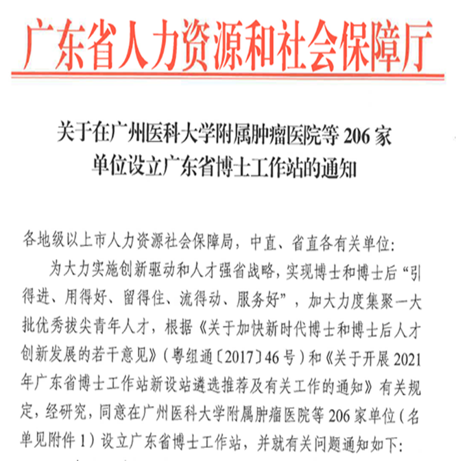 近日,根据广东省人力资源和社会保障厅印发的《关于在广州医科大学附属肿瘤医院等206家单位设立广东省博士工作站的通知》,我院成功获批设立广东省博士工作站。此次我院获批设立广东省博士工作站,是对我院科研能力、综合管理水平及服务能力的肯定,意味着我院将具备吸纳、引进、聚集更多博士博士后人才的资格和能力,是我院人才队伍建设的一次飞跃,也是我院构建高层次人才队伍的一个新的里程碑!