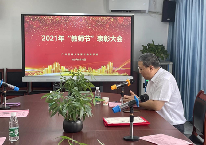 9月10日下午,广州医科大学第五临床学院举行教师节表彰大会,活动表彰了在2020-2021学年表现突出、取得优异成绩的优秀教师和集体。同时号召全学院教师向优秀者学习,学习他们爱岗敬业、忠于职守的高尚情操,求真务实、团结协作、勇于探索、精益求精的工作作风,兢兢业业、任劳任怨的工作态度,严于律己、乐于奉献的优秀品质。