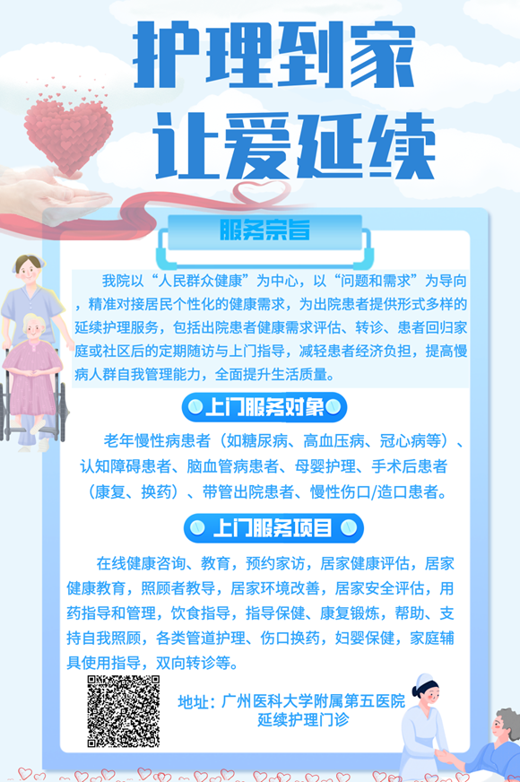 广医五院延续护理门诊涵盖了伤口造口护理、慢病管理、老年护理、母婴护理、骨科护理、肿瘤护理等多专业的护理专家组成的“广医五院护理天团”,为患者群众提供多学科护理服务,全方面满足患者康复的多方面护理需求。