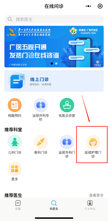 2、进入“广医五院在线诊室”小程序后,选择“延续护理门诊”。