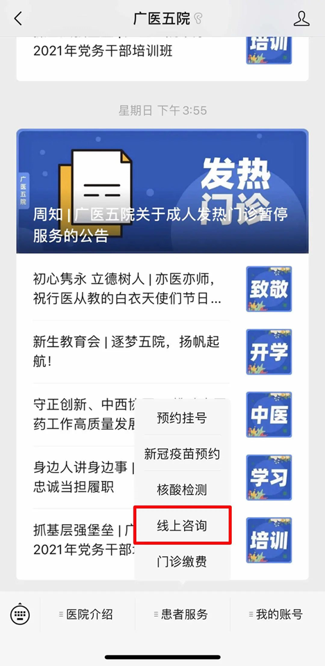 1、打开“广医五院”微信公众号,点击“线上咨询”。