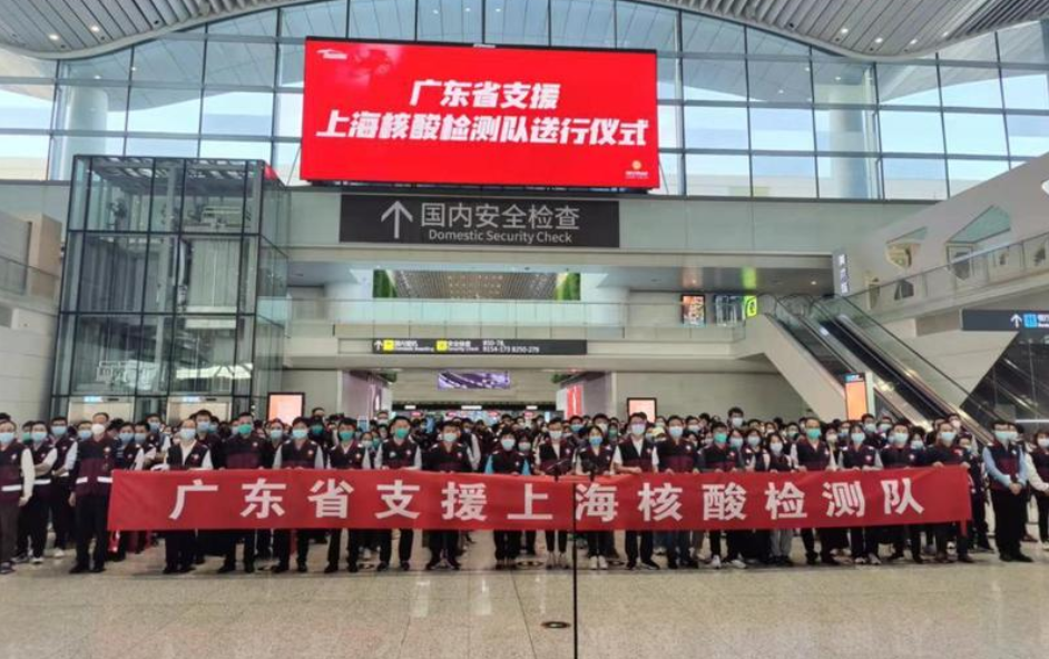 与此同时,医院各部门也迅速完成支援物资准备工作,两名队员于 4月3日下午2点从医院整装出发,下午4点准时到达广州白云国际机场,与广东省支援上海核酸检测队集合,准备出发。
