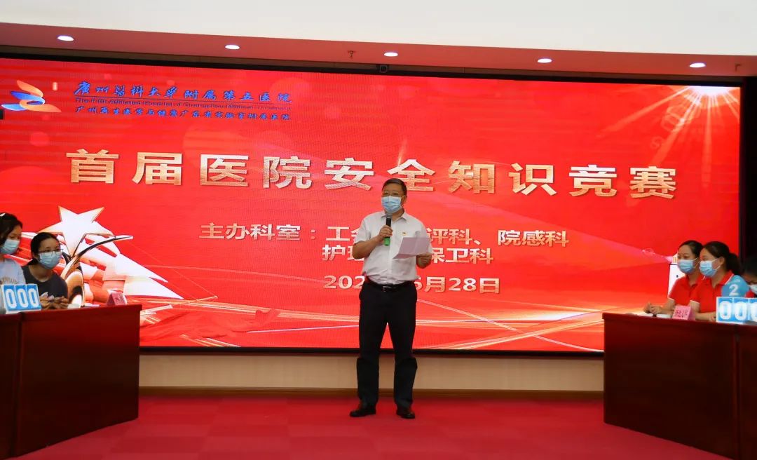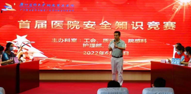 为提高医院安全防范意识,树牢安全生产生活理念,提升医院职工安全意识和应急能力,以实际行动迎接党的二十大胜利召开,6月28日下午,由广医五院工会牵头,医疗质量管理评价科、医院感染管理科、保卫科、护理部五部门联合举办的广医五院首届“医院安全知识竞赛”决赛在学术报告厅热烈开赛。医院党委李蕃俊书记、陈益民副院长、江先汉副院长及部分职能部门科长、临床医技员工近百人参加活动。