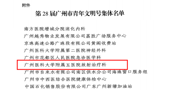 近日,共青团广州市委员会发布了《关于命名第28届广州市青年文明号的决定》,广医五院放射治疗科喜获“青年文明号”荣誉称号。