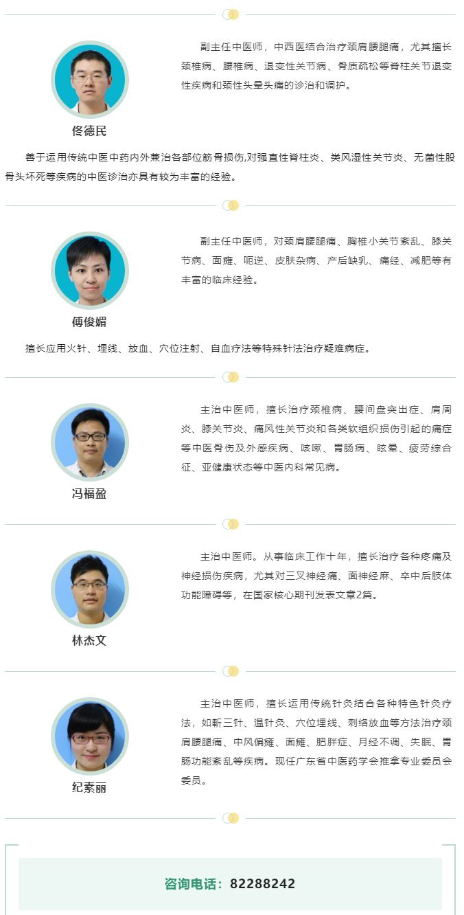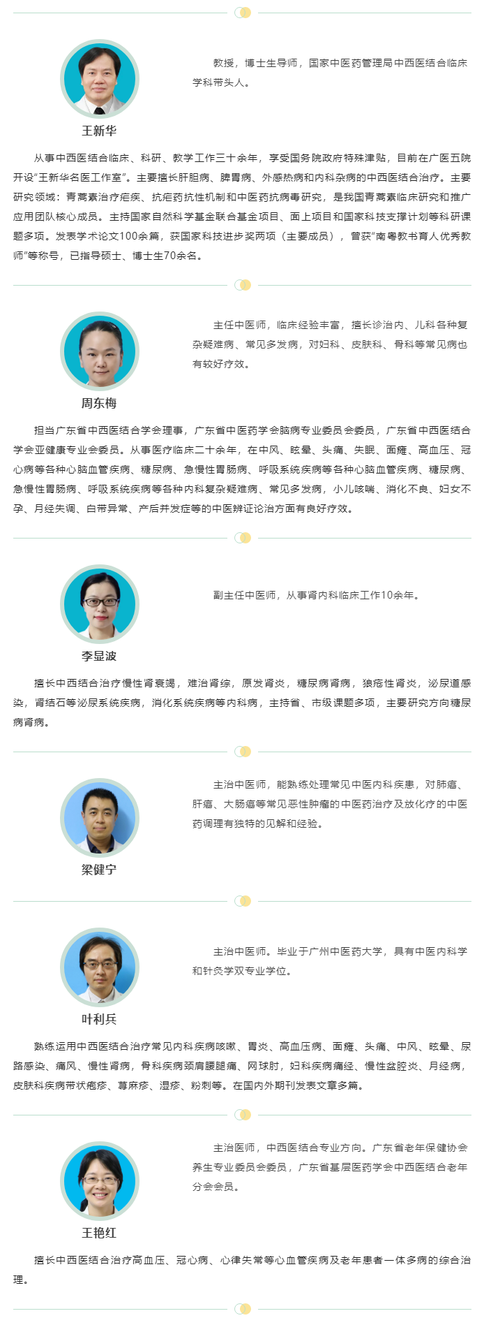 以中西医结合临床重点学科带头人、广州市新冠肺炎中医药防治专家组长王新华教授为核心的中医新冠治疗专家组,汇聚了中医科中医内科、中医骨伤及针灸推拿专科方向的骨干力量,秉承中医辨证论治的治疗原则,个性化的为新冠病毒感染“阳康”后患者制定专属的中药方剂和特色中医治疗项目。目前开设的中医特色治疗项目有针刺、温针、皮内针、耳针、中医火针、隔物灸、中医督灸、放血疗法、中药熏蒸、刺络拔罐走罐、中药泡洗及手法按摩点穴等。