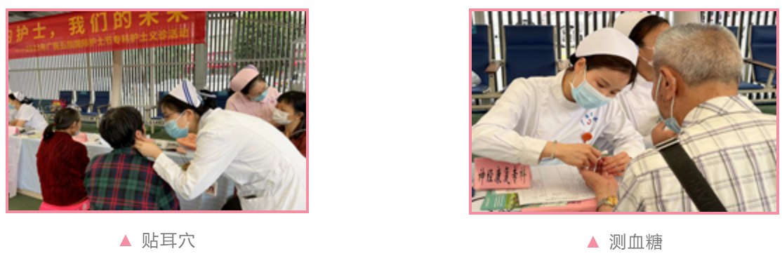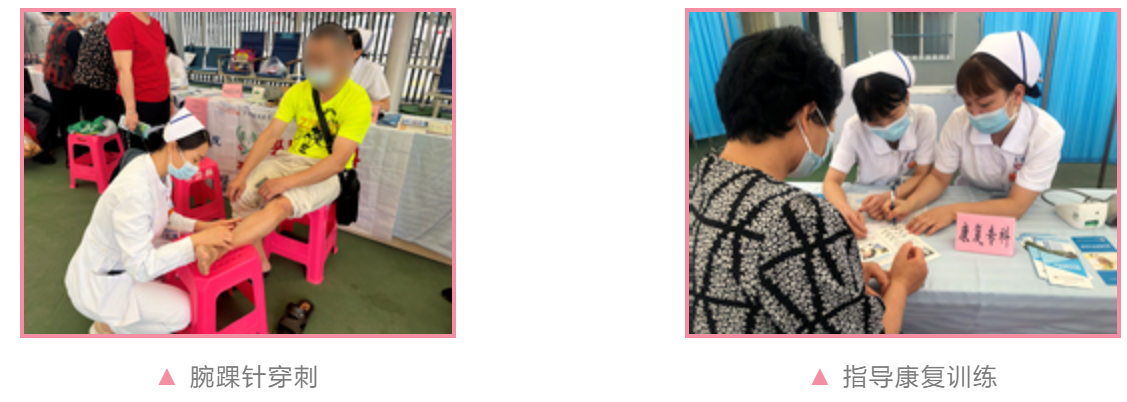 每天的义诊都热闹非凡,人来人往,络绎不绝,有血压管理咨询、血糖管理咨询、导管维护需求等,其中台前最热闹的非康复专科莫属,常常有不少市民排起长队等候就诊。颈椎病的康复操、手法按摩、八段锦;治疗睡眠障碍的耳穴压豆、肺功能的康复锻炼、心脏功能的康复锻炼等琳琅满目的康复方法,充分展现了康复专科护理人员的技术功底,受到了广大市民的欢迎与喜爱。