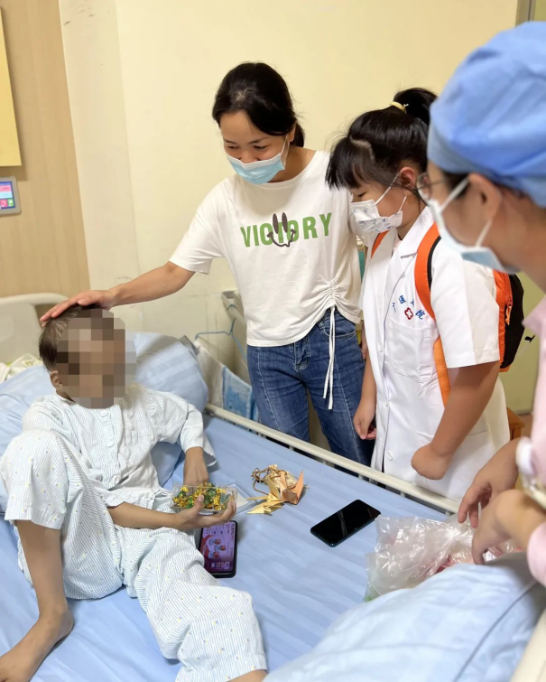 离开产科,进入儿童肿瘤病房。孩子们在几位志愿者的指导下折起了形状各异的小动物,在病房护士姐姐的带领下给这里的小病人送上了他们亲手制作的香囊、折纸,也送上了他们的祝福。在这里,孩子们感受到了不一样的生命。