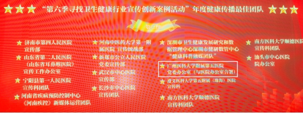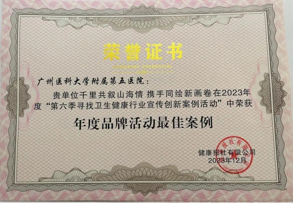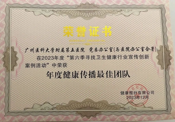 2023年12月6日至8日,由《健康报》社主办的健康报社特约记者通讯员能力提升交流会暨卫生健康综合宣传服务平台第15届年会在广东省汕头市召开,广医五院荣获2023年度“第六季寻找卫生健康行业宣传创新案例活动”年度品牌活动最佳案例,党委办公室(与医院办公室合署)荣获年度健康传播最佳团队。