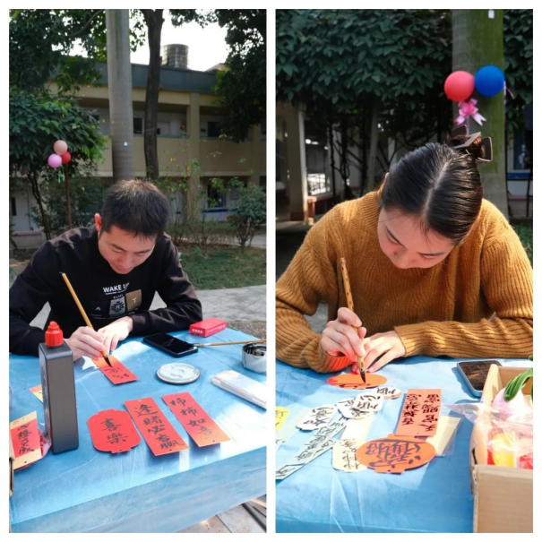 书法协会的帅哥美女则充分发挥了他们的书法专长,现场挥毫,为女同胞们手书洒金的书签、挂件、心愿贴。