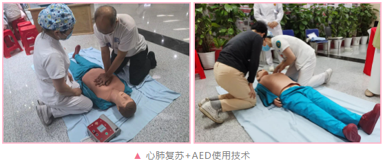 应急救护培训现场,急诊专科护士们进行心肺复苏术、海姆立克急救法手把手教学,提高市民急救意识,掌握自救互救基本知识与技能。