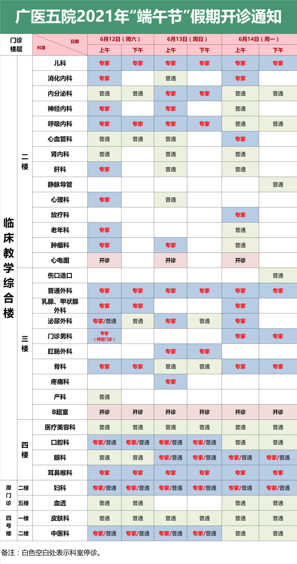 端午假期将至,根据《国务院办公厅关于2021年部分节假日安排的通知》精神,2021年端午假期时间为6月12日(周六)至6月14日(周一)共3天。广州医科大学附属第五医院对端午假期期间的门诊开诊情况做如下安排: