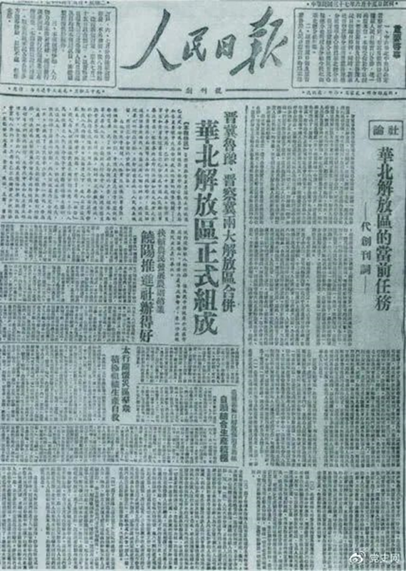 ▲ 1948年6月15日,晋冀鲁豫解放区《人民日报》与《晋察冀日报》合并后出版的《人民日报》创刊号。