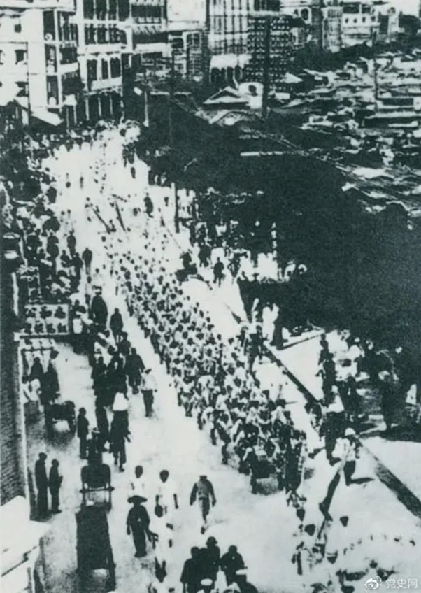 ▲ 从1925年6月19日起,香港和广州租界的20万工人举行罢工,声援上海人民的反帝斗争。23日,广州和由香港回广州的工人10万余人举行大游行,在沙基惨遭英、法帝国主义的镇压。图为当时的游行队伍。