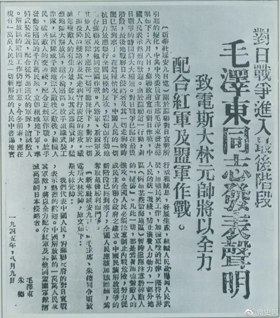 同日 毛泽东就苏联对日宣战发表声明。声明指出:中国人民热烈欢迎苏联对日宣战,最后地战胜日本侵略者及其一切走狗的时间已经到来了。中国人民的一切抗日力量应举行全国规模的反攻,密切而有效力地配合苏联及其他同盟国作战。八路军、新四军及其他人民军队,应在一切可能条件下,对于一切不愿投降的侵略者及其走狗实行广泛的进攻。这篇声明以《对日寇的最后一战》为题,收入《毛泽东选集》第三卷。
