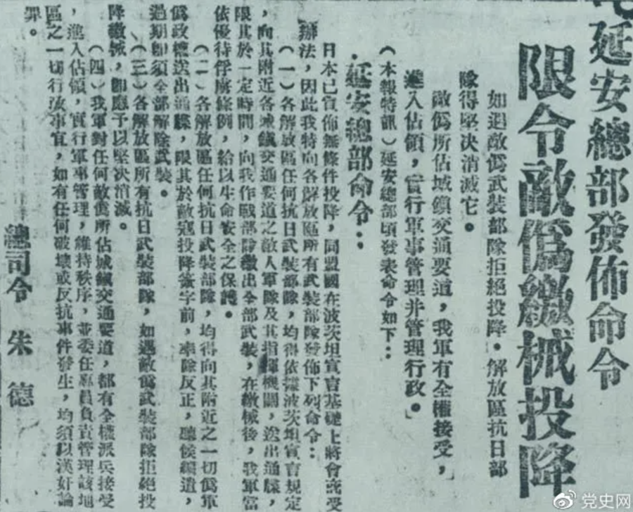 8月11日 中共中央作出《关于日本投降后我党任务的指示》,指示全党全军立即争取和保卫抗日胜利果实。