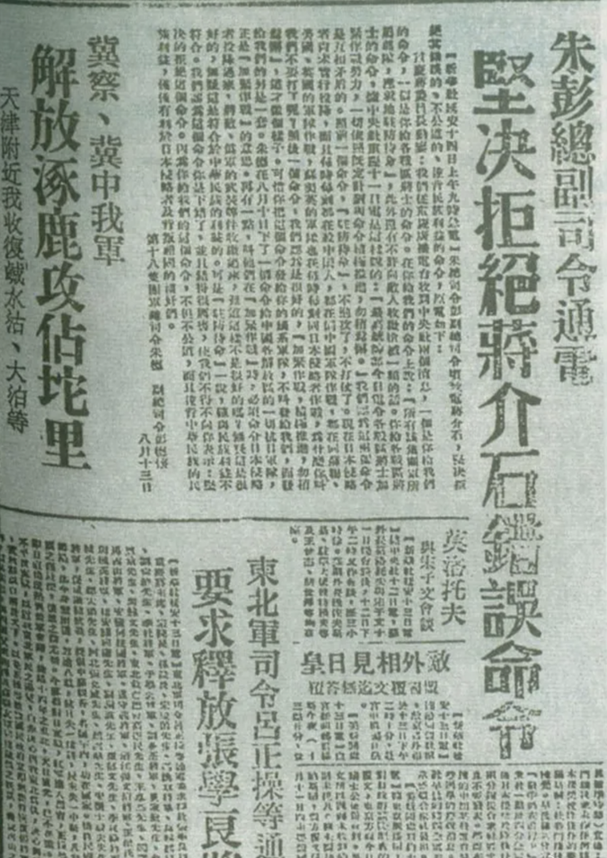 8月13日 朱德总司令、彭德怀副总司令致电蒋介石,坚决拒绝其11日下达的三道“命令”:一是要解放区人民军队“就原地驻防待命”,不得向敌伪“擅自行动”;二是要他的嫡系部队“加紧作战”,“勿稍松懈”;三是要日、伪军“切实负责维持地方治安”。15日,朱德总司令命令在南京的日本中国派遣军总司令官冈村宁次及其所属一切部队,停止一切军事行动,听候八路军、新四军及华南抗日纵队的命令,向中国共产党领导的军队投降(被国民党军队包围的日军除外)。