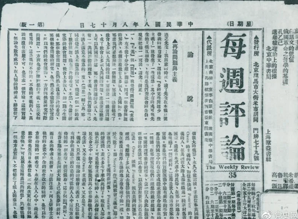 ▲ 1919年8月17日,李大钊在《每周评论》第35期发表《再论问题与主义》一文,对胡适的观点作了严正的批驳。