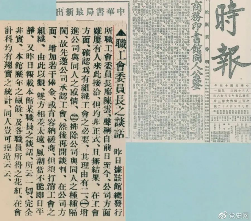 ▲ 1925年8月24日,上海《时报》刊载的陈云在商务印书馆大罢工第二天发表关于争取组织工会自由作为取得这次罢工斗争胜利的最基本条件的谈话。
