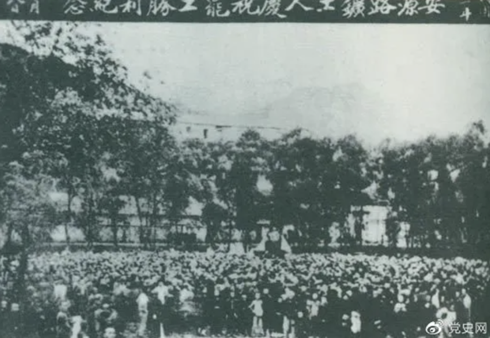 ▲ 1922年9月14日-18日 安源路矿工人在毛泽东、李立三、刘少奇等组织领导下,举行罢工斗争,取得胜利。图为安源路矿工人庆祝罢工胜利。