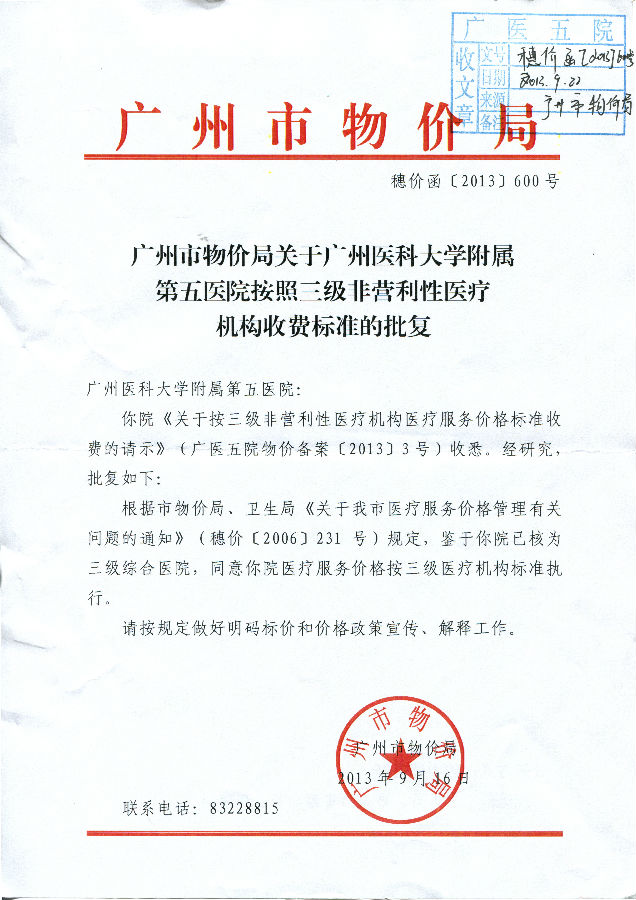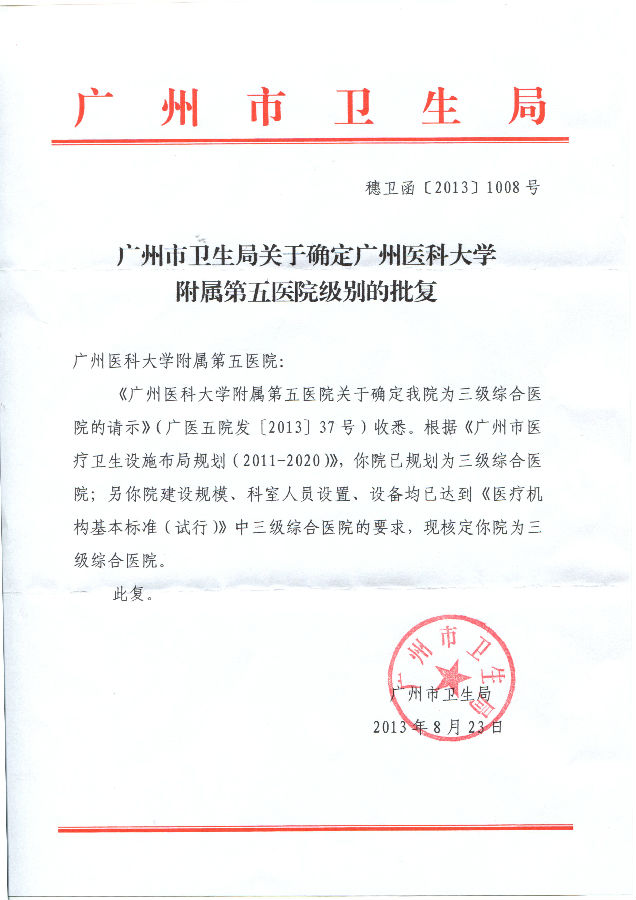 广州市卫生局关于确定广州医科大学附属第五医院级别的批复187