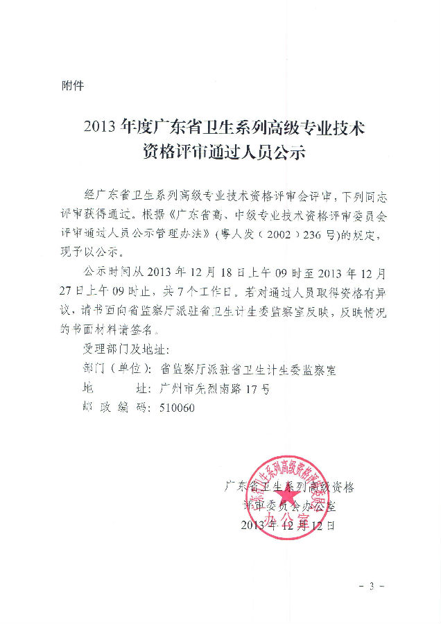 2013年度广东省卫生系列高级专业技术资格评审通过人员公示