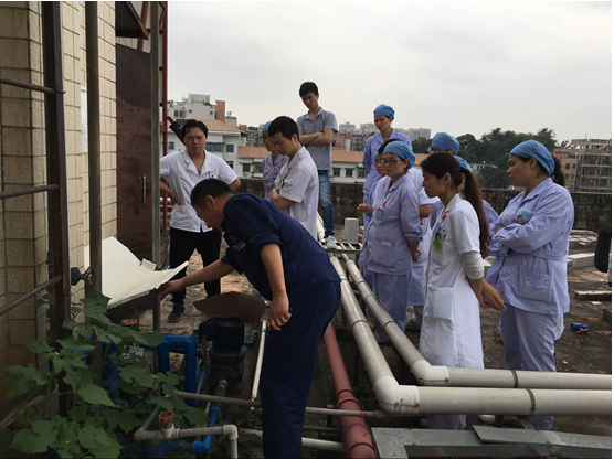 最后大家跟随设备科的杨工程师、朱工程师来到水处理机房,他们给大家科普了普通水是如何变为“双级反渗水”的原理,细致的讲解在使用过程中应关注的重点和数据、如何操作不当会使机器受损等问题。不管是医生、护士还是水电工程师,大家都很认真聆听,机器运转的轰鸣声也阻止不了大家的学习热情。