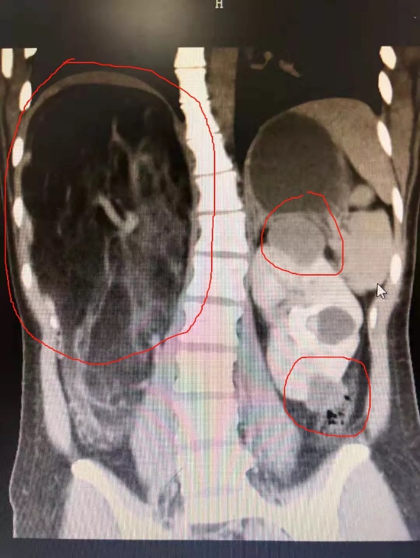 胸片显示脊柱侧弯、红圈内容为双肾肿瘤