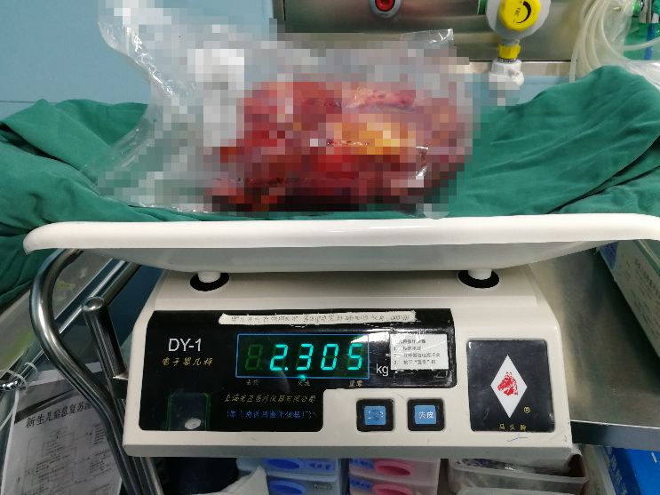 术中发现,右肾肿物直经接近30公分,与肝脏、脾脏和肠道等体内重要器官紧贴着,经过医生的共同努力,终于切除了双侧肾脏肿物,右肾取出肿物重达4.6斤,约相当于20倍正常肾脏重量!在这样的手术难度下,泌尿外科团队成功为心心保留双侧肾脏!